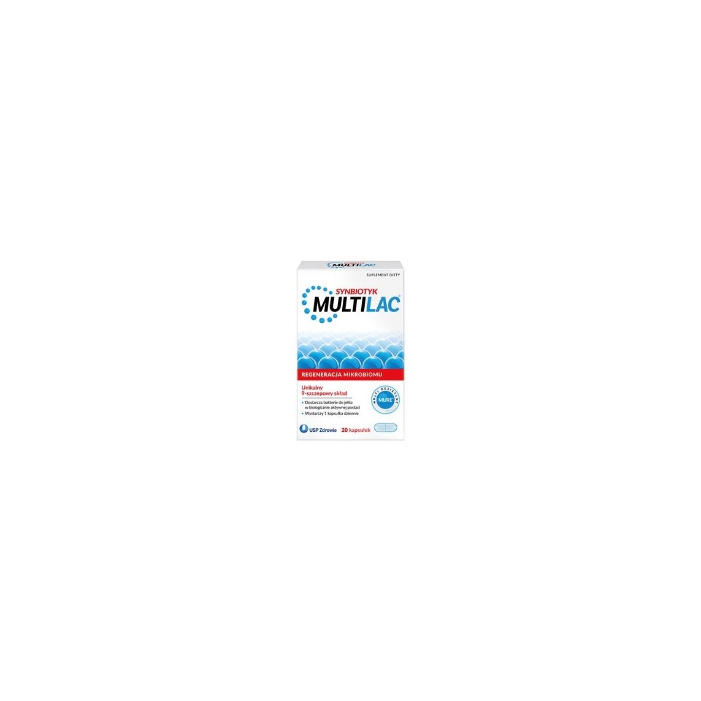Multilac is a modern dietary supplement designed to replenish weakened intestinal flora. The product si a unique combination of prebiotics and nine specially selected bacterial strains, increasing the chance of effectively adapting to the body's individual microbiome. The use of prebiotics supports the rapid multiplication of beneficial bacteria and promotes the rebuilding of the intestinal microbiome. Thanks to the innovative MURE (Multi Resistant) protective technology, the bacteria demonstrate high resistance to adverse external factors, such as temperature, gastric juice, bile, and digestive enzymes. This allows them to reach the intestines in their biologically active form. Multilac is intended for use in adults and children, particularly during and after antibiotic therapy, as well as during periods of increased risk of weakened intestinal flora, such as the fall and winter seasons. The product is convenient to use and does not require refrigeration.