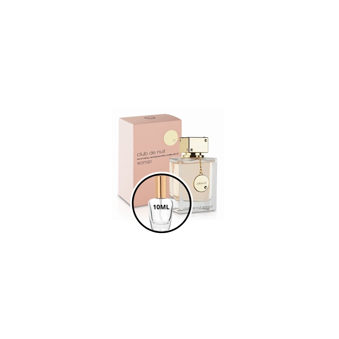 Armaf Club De Nuit Women – een decant van 10 ml met een bloemig-fruitige, sensuele compositie voor vrouwen, die frisse citrus combineert met roos, lychee en een omhullende vanille-muskbasis.